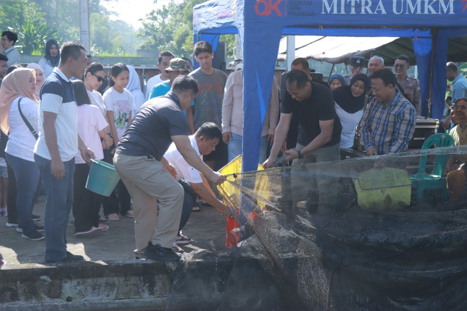 Kegiatan panen ikan yang berlangsung di tanah Polri di desa Bacem kecamatan Ponggok kabupaten Blitar dihadiri oleh jajaran kepolisian serta masyarakat sekitar.