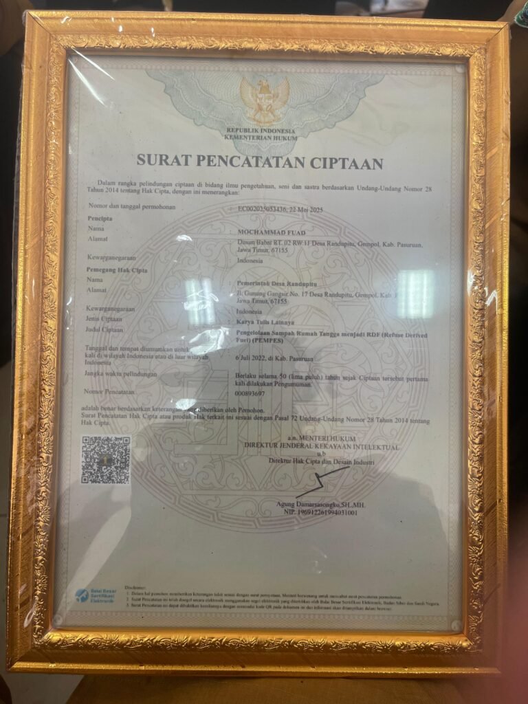 Namun di tengah persoalan tersebut, sosok Mochammad Fuad, Kepala Desa Randupitu, tampil sebagai inisiator perubahan. Melalui kerja keras bertahun-tahun, ia berhasil menciptakan sistem pengelolaan sampah berkelanjutan berbasis Refuse Derived Fuel (RDF) yang tidak hanya mengurangi limbah, tetapi juga menghasilkan energi alternatif. Inovasi ini bahkan telah memperoleh pengakuan hukum berupa hak cipta dari Kementerian Hukum dan HAM Republik Indonesia.