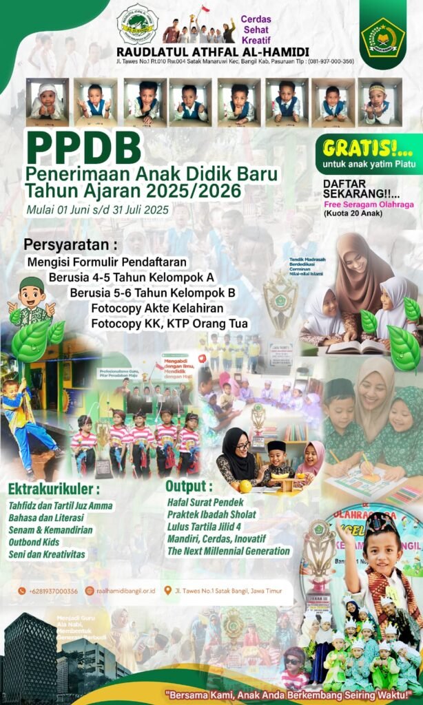 Dengan semangat mendidik generasi Qurani yang cerdas dan berakhlakul karimah, PPDB RA Al Hamidi tahun ini hadir bukan hanya sebagai proses penerimaan siswa baru, tapi juga sebagai panggilan bagi masyarakat untuk turut serta mencerdaskan kehidupan bangsa sejak usia dini. Kebijakan pendidikan gratis untuk anak yatim dan ragam kegiatan unggulan yang penuh makna menjadikan RA Al Hamidi sebagai pilihan utama orang tua yang menginginkan pendidikan terbaik dan bermakna untuk buah hati mereka.