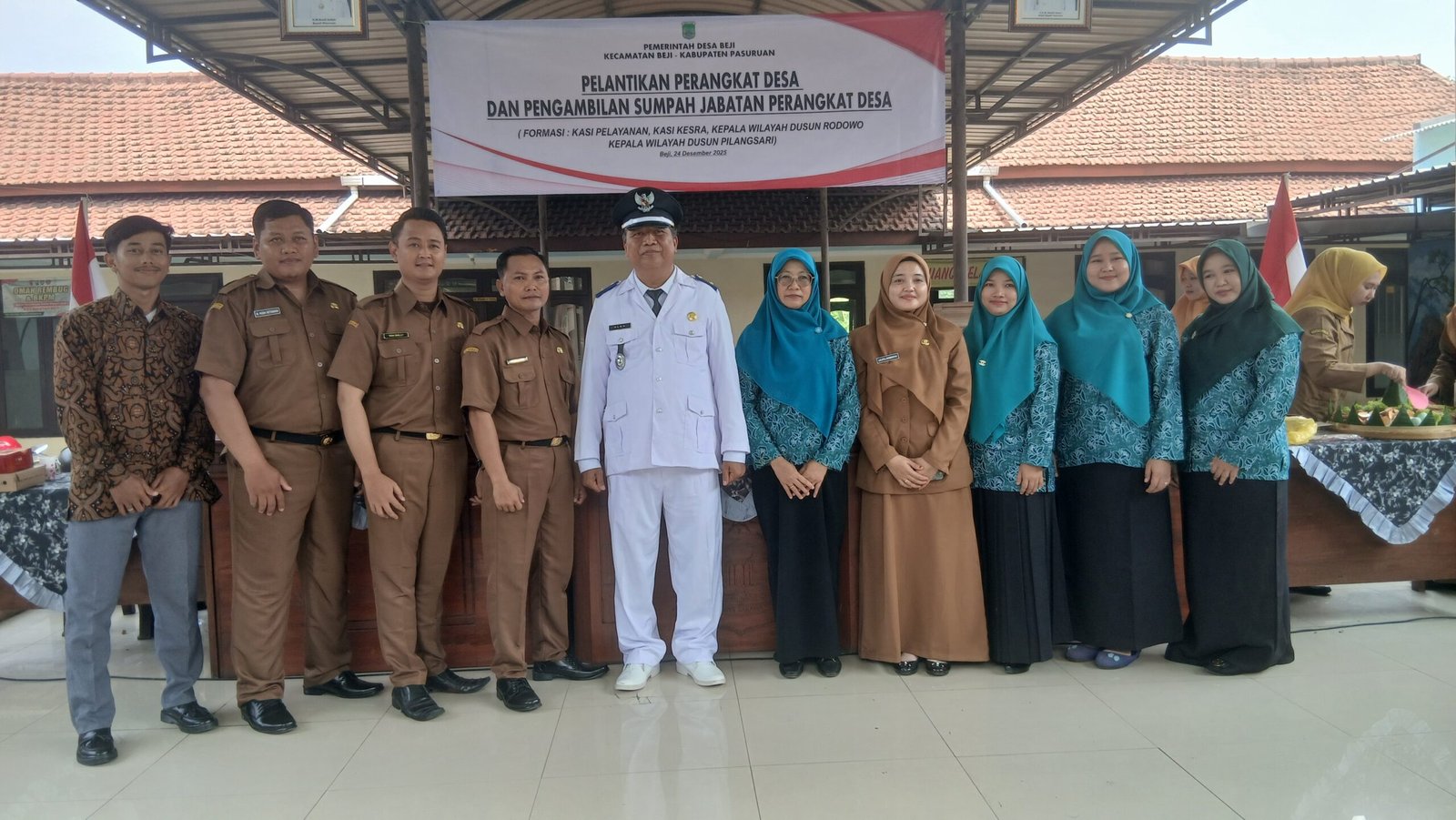 Pelantikan dan pengambilan sumpah jabatan dipimpin langsung oleh Kepala Desa Beji, H. Elok, S.H., M.Hum. Dalam kegiatan tersebut, sebanyak empat orang resmi dilantik sebagai perangkat Desa Beji, yakni Samsul Arifin sebagai Kepala Wilayah Dusun Pilangsari, Lailatur Khomaria sebagai Kepala Seksi Pelayanan, M. Huda Setiawan sebagai Kepala Seksi Kesejahteraan, serta Roma Sono, S.T sebagai Kepala Wilayah Dusun Rodowo.