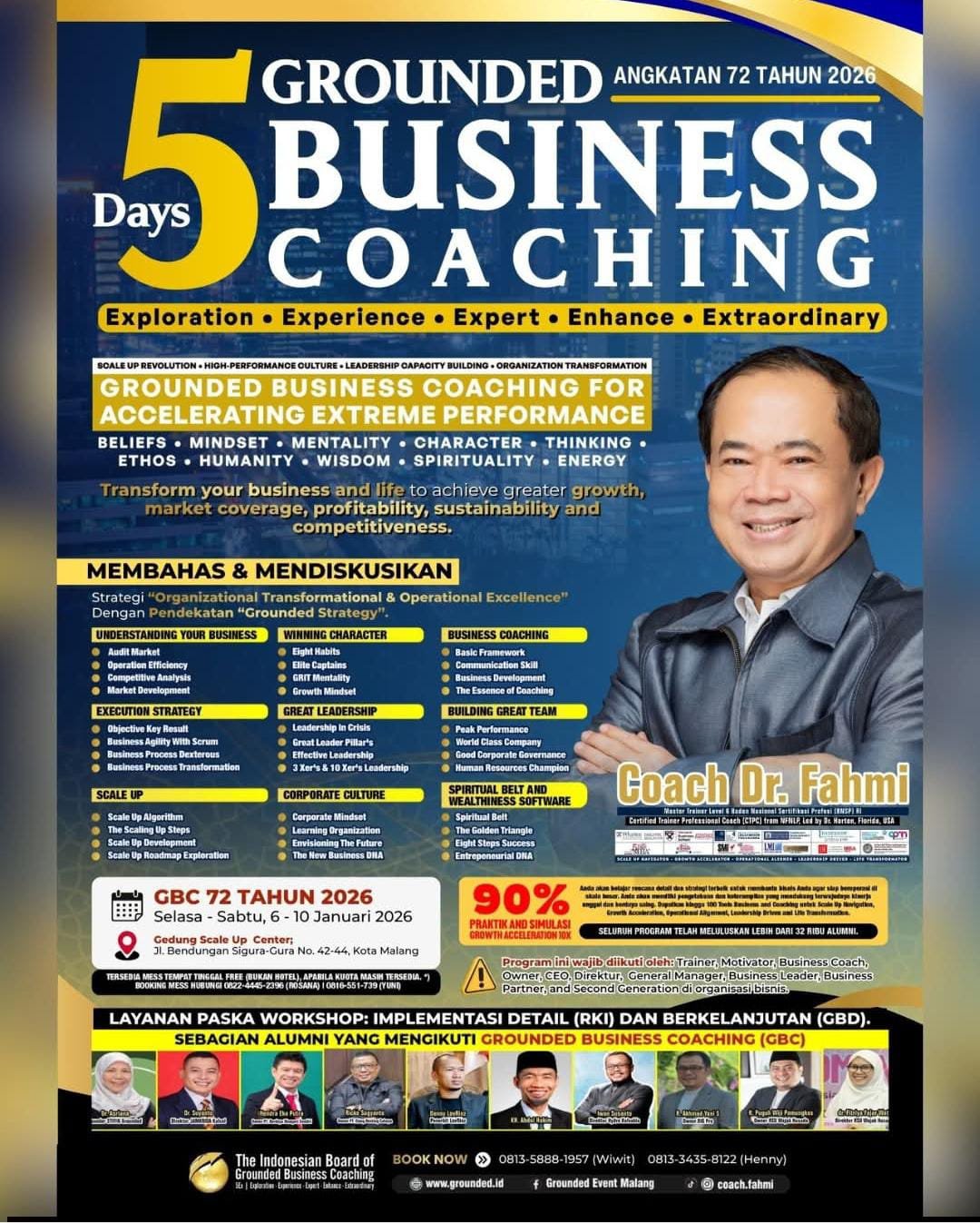 Malang, Kabarjatim.id — Pelaksanaan Workshop 5 Days Grounded Business Coaching (GBC) 72 di Malang menjadi upaya nyata mendorong lahirnya pelaku usaha yang tidak hanya berorientasi pada keuntungan, tetapi juga memiliki kesadaran diri dan nilai yang kuat dalam menjalankan bisnis.