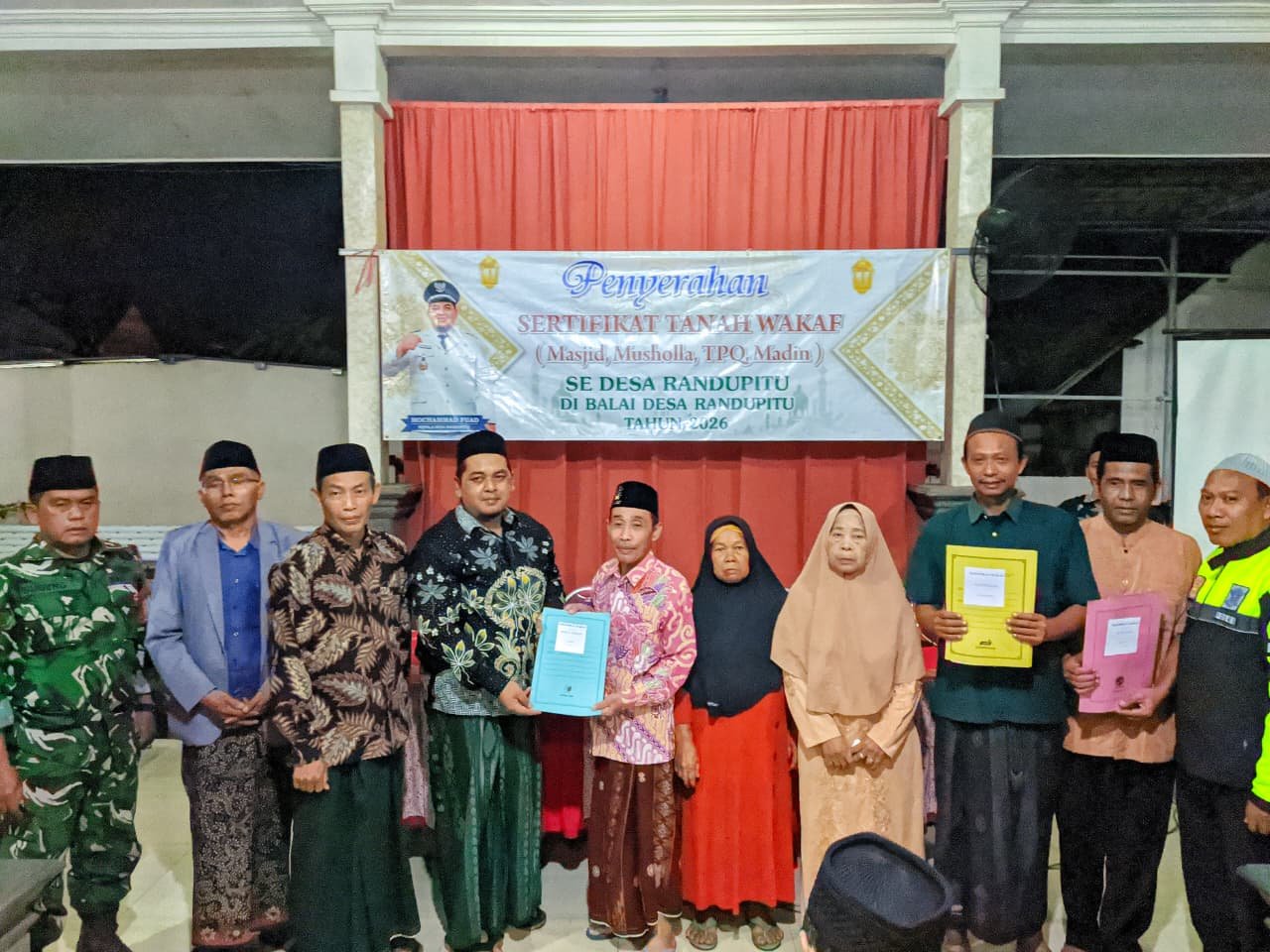 Sebanyak 48 sertifikat tanah wakaf diserahkan dalam kegiatan ini. Sertifikat tersebut mencakup dua masjid, dua pondok pesantren, dua TPQ/Madin, serta 42 musala yang tersebar di seluruh wilayah Desa Randupitu.