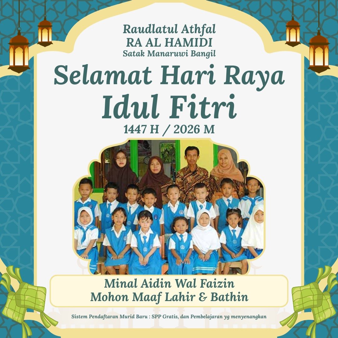 Kabarjatim.id | Pasuruan – Dalam suasana penuh kebahagiaan dan kemenangan, keluarga besar Raudhatul Athfal (RA) Al-Hamidi Manaruwi Bangil menyampaikan ucapan Selamat Hari Raya Idul Fitri 1447 Hijriah / 2026 Masehi kepada seluruh umat Muslim, khususnya wali murid dan masyarakat sekitar.